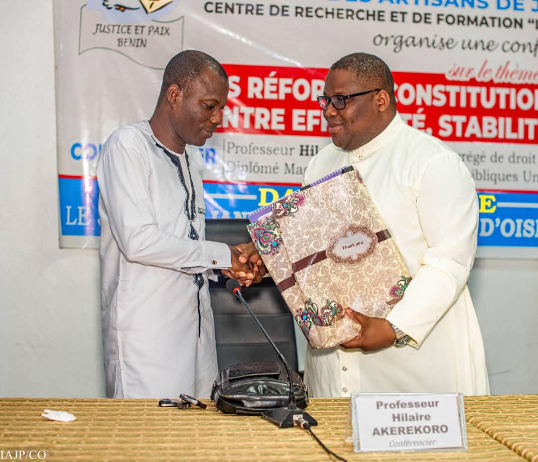 Pour leur conférence inaugurale de l’année, les responsables de l’Institut des Artisans de Justice et de Paix (IAJP) ont, sous la coupole du Père Éric Aguénounon, Directeur dudit Institut, décidé d’aborder l’épineuse question des réformes constitutionnelles en Afrique. À cet effet, ils ont fait appel à un éminent universitaire qui s’y connaît bien. Il s’agit de Monsieur Hilaire Akérékoro, Professeur agrégé de droit public (CAMES), Professeur titulaire des universités, diplômé d’études littéraires, diplômé Magna Cum Laude d’études bibliques à l’Université d’Abomey-Calavi (UAC). Selon l’homme de droit, le résultat d’une révision constitutionnelle est appelé réforme constitutionnelle, un processus qui fait intervenir plusieurs voix, dont la plus haute autorité se traduit par la souveraineté du peuple, la loi référendaire et la loi institutionnelle. Toutefois, la réforme peut prendre deux formes principales : l’adoption d’une nouvelle Constitution, qui marque le plus souvent l’avènement d’une nouvelle République, ou la modification d’une Constitution existante par des mécanismes de révision. À cet effet, plusieurs pays ont été cités en exemple par le conférencier, notamment le Togo, le Bénin, le Cameroun et la République démocratique du Congo.